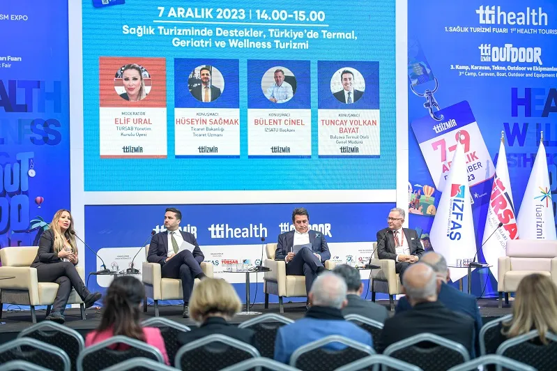 17. TTI İzmir Uluslararası Turizm Ticaret Fuar ve Kongresi ile TTI Health 1. Sağlık Turizmi Fuarı kapsamında, sektör temsilcilerinin katılımıyla “Sağlık Turizminde Destekler, Türkiye’de Termal, Geriatri ve Wellness Turizmi” konuşuldu. Ticaret Bakanlığı Ticaret Uzmanı Hüseyin Sağmak, “2022 yılında sağlık turisti sayısı 1,2 milyon olurken 2023 yılının ilk 9 ayında 1 milyon sağlık turisti sayısını yakalamış bulunmaktayız. Sağlık ihracatı gelirlerimizde ise 2022 yılında, 2,1 milyar doları yakaladık” dedi.