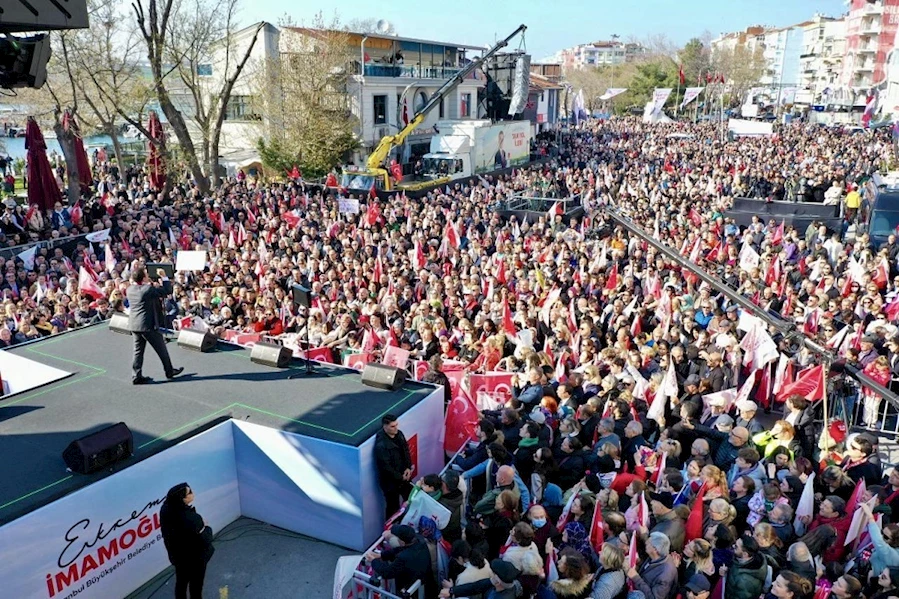 “Onlar ‘kanal’ diyor, biz ‘İstanbul’ diyoruz” diyen İmamoğlu, “Yatıyorlar, kalkıyorlar ‘kanal.’ Gündemlerinde yokmuş gibi davranıyorlar ama inanmayın. İnanmıyorsunuz değil mi? Allah korusun; sakın ha. Çünkü onlar, Kanal İstanbul'u yapmaya mecburdurlar. Şimdi bakın; ne Büyükşehir adayları ‘Kanala karşıyım’ diyebilir ne buradaki ne Silivri'deki ne başka bir yerdeki diyemez. Korkarlar, fırça yerler diye. Öyle değil mi? Onun için, bir yandan ihalelere devam ediyorlar. Verilmiş sözleri var, taahhütleri var. Hem de çoğu yurt dışından, buradan da değil. Onlar İstanbul’un kaynaklarını yerli, yabancı, bir avuç insana aktarmaya çalışıyorlar. Vatandaşa kaşıkla verdiklerini, kepçeyle geri alıyorlar. Size söz; şart olsun, görevimin son anına kadar, milletimin en zor anında yanında olacağım. Milletin parasını, millet vereceğiz. Ben, halka ait alanları halka açacağım. Ben İstanbul'un muhafızı olmayı, bu şehrin doğal ve tarihi zenginliklerine gözüm gibi bakmayı bilirim. Siz beni bu şehri israftan, ranttan, ihanetten koruyun diye işbaşına getirdiniz; öyle değil mi? Ben sizin yüzünüzü kara çıkarmayacağım. Yeter ki siz bizim arkamızda durun, bizi desteklemeye devam edin. Ben size layık olmaya devam edeceğim” şeklinde konuştu.