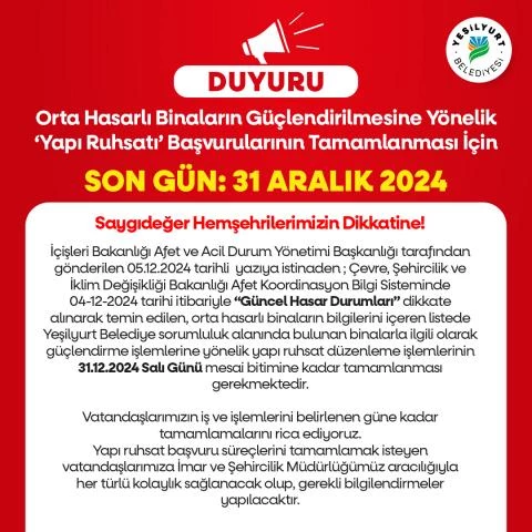 Son başvuru tarihi 29 Aralık 2023 olan süreçte başvurularını yapıp, 5 Temmuz 2024 tarihine kadar olan sürece kadar başvuru işlemlerini sonuçlandıramayan vatandaşlara çağrıda bulunan Başkan Geçit, “İçişleri Bakanlığı Afet ve Acil Durum Yönetimi Başkanlığı tarafından gönderilen 05.12.2024 tarihli yazıya istinaden; Çevre, Şehircilik ve İklim Değişikliği Bakanlığı Afet Koordinasyon Bilgi Sisteminde 04-12-2024 tarihi itibariyle “Güncel Hasar Durumları” dikkate alınarak temin edilen, orta hasarlı binaların bilgilerini içeren listede belediyemizin sorumluluk alanında bulunan binalarla ilgili olarak güçlendirme işlemlerine yönelik yapı ruhsat düzenleme işlemlerinin 31.12.2024 Salı Günü mesai bitimine kadar tamamlanması gerekmektedir. Vatandaşlarımızın iş ve işlemlerini belirlenen güne kadar tamamlamalarını rica ediyoruz. Yapı ruhsat başvuru süreçlerini tamamlamak isteyen vatandaşlarımıza İmar ve Şehircilik Müdürlüğümüz aracılığıyla her türlü kolaylık sağlanacak olup, gerekli bilgilendirmeler yapılacaktır.” dedi.