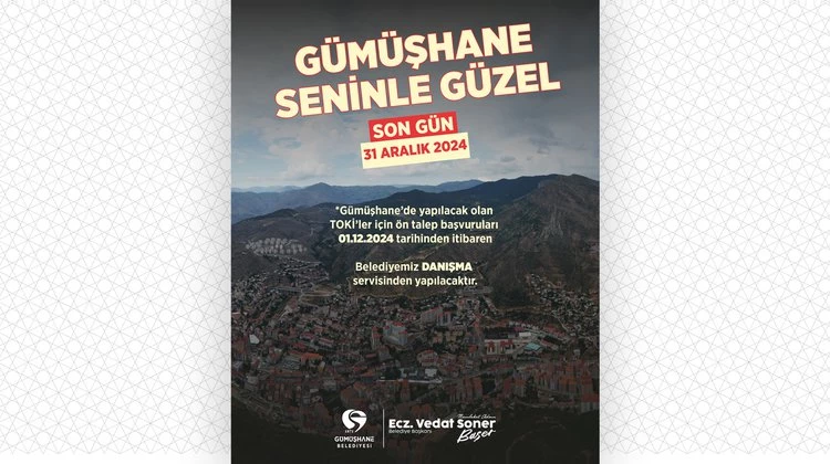 Gümüşhane’de yapılacak olan TOKİ’ler için talep başvuruları 01.12.2024 tarihinden itibaren belediyemiz DANIŞMA servisinden yapılacaktır. Son gün 31 Aralık 2024 20 Kasım 2024, Çarşamba Gümüşhane,Gümüşhane Belediyesibelediye365.com