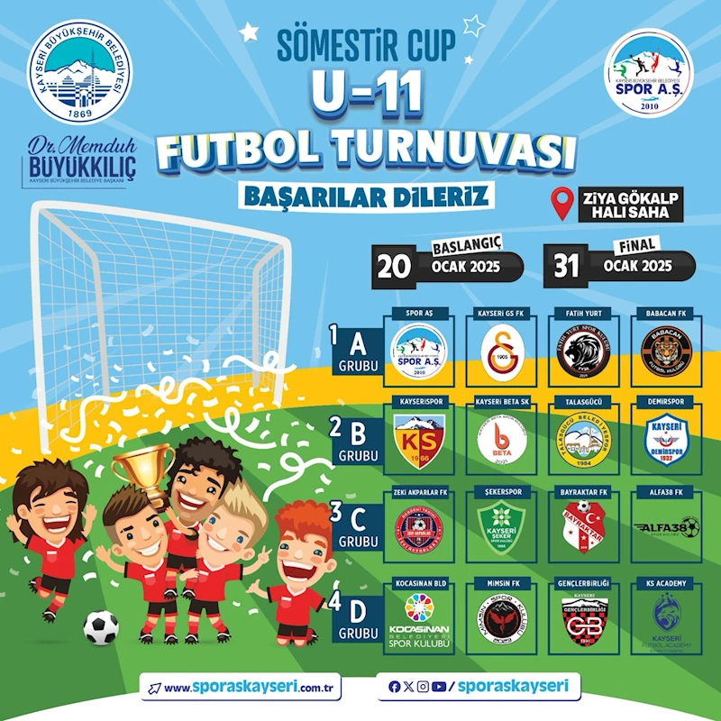 Büyükşehir Belediyesi Spor A.Ş. bu kez genç yetenekleri bir araya getirdiği Sömestir Cup U11 Futbol Turnuvası ile sporseverlere eğlenceli bir etkinlik sunuyor.