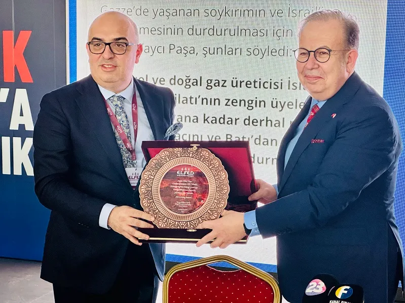 Yoğun katılımın olduğu konferansın sonunda ELFED Başkanı Kazım Gökhan Elgin tarafından Cihat Yaycı’ya plaket takdim edildi. Ardından hatıra fotoğrafı çekildi.