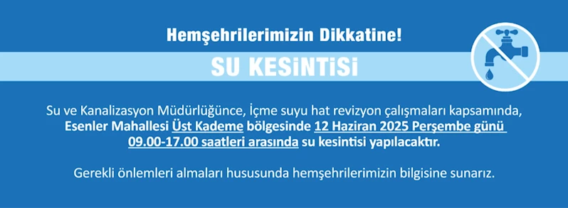 Su ve Kanalizasyon Müdürlüğünce, İçme suyu hat revizyon çalışmaları kapsamında, Esenler Mahallesi Üst Kademe bölgesinde 12 Haziran 2025 Perşembe günü 09.00-17.00 saatleri arasında su kesintisi yapılacaktır.