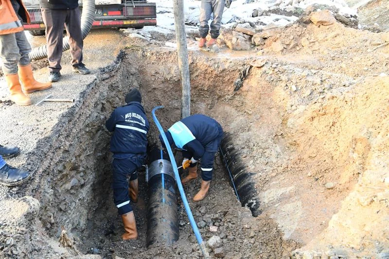 Muş Belediyesi Su ve Kanalizasyon Müdürlüğüne bağlı ekipler, Karşıyaka Mahallesinde yaşanan su patlağına anında müdahale etti.