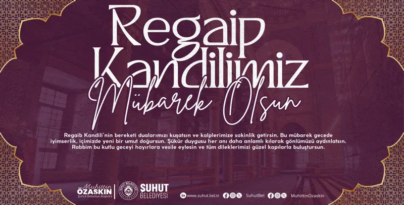 Şuhut Belediye Başkanı Muhittin Özaşkın, Regaib Kandili dolayısıyla bir mesaj yayımlayarak, bu mübarek gecenin ve üç ayların birlik, beraberlik ve manevi yenilenme için bir fırsat olduğunu belirtti.