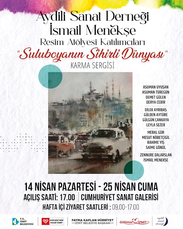 İzmit Belediyesi, Aydili Sanat Derneği bünyesinde faaliyet gösteren İsmail Menekşe Resim Atölyesi katılımcılarının eserlerinden oluşan ‘Suluboyanın Sihirli Dünyası’ karma sergisine ev sahipliği yapacak
