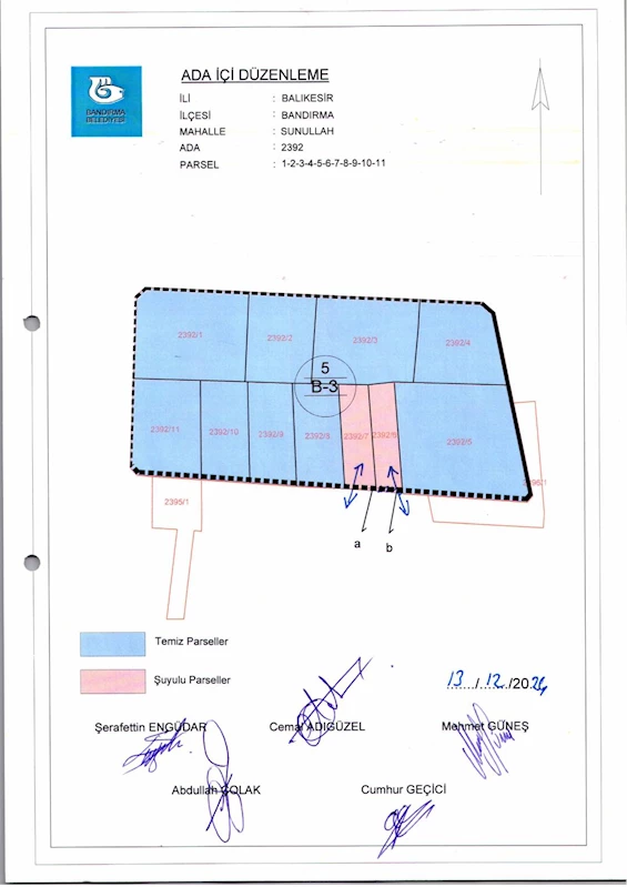 Belediye Encümeninin 18.12.2024 tarih ve 1232 sayılı Encümen kararı ile Sunullah Mahallesi, 2392 ada 1, 2, 3, 4, 5, 6, 7, 8, 9, 10, 11 nolu parsellere ait ada içi düzenlemesinin, 1/1000 ölçekli Bandırma Uygulama İmar Planı notlarının 137. Maddesi ve 3194 sayılı İmar Kanununun 19. maddesi gereği onaylanmasına,