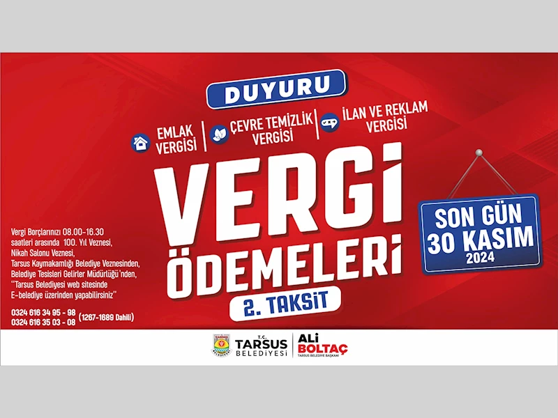 Tarsus Belediyesi tarafından, vergi mükelleflerinin ödemelerini 08.00-16.30 saatleri arasında Nikah Salonu Veznesi, 100. Yıl Veznesi, Tarsus Kaymakamlığı Belediye Veznesi, Belediye Tesisleri Gelirler Müdürlüğü veya Tarsus Belediyesi’ne bağlı https://ebelediye.tarsus.bel.tr/ web sitesi üzerinden kolaylıkla yapabileceği hatırlatıldı. 0324 616 34 95-98, 0324 616 35 03 – 08 numaralarından 1267-1689 dahili numarayı arayarak bilgi alabilecekler.
