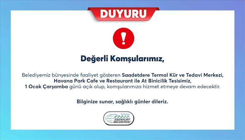 Saadetdere Termal Kür ve Tedavi Merkezi, Havana Park Cafe ve Restaurant ve At Binicilik Tesisimiz 1 Ocak 2025 Çarşamba günü açık olup komşularımıza hizmet etmeye devam edecektir.