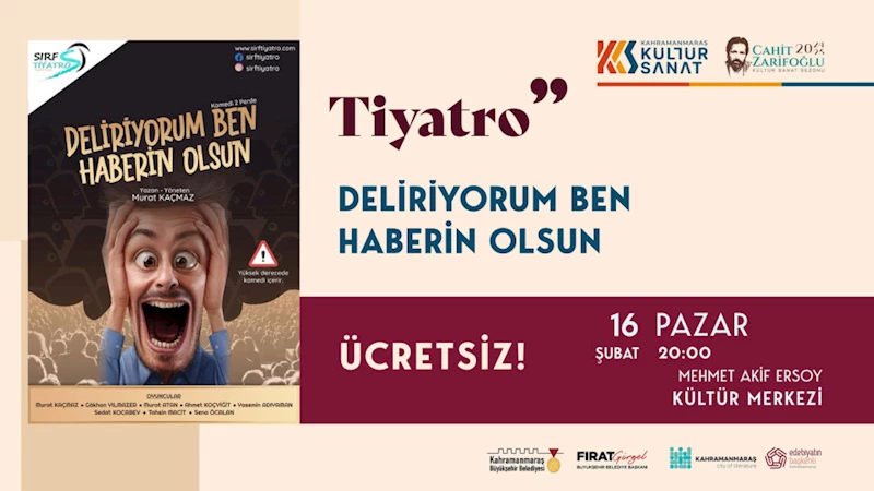 Kahramanmaraş Büyükşehir Belediyesi, kültür sanat etkinlikleri kapsamında tiyatroseverlere özel bir gösteri sunmaya hazırlanıyor. Farklı yaş gruplarına yönelik etkinlikleriyle dikkat çeken Büyükşehir Belediyesi, bu kez yetişkinler için kahkaha dolu bir tiyatro gösterisi düzenliyor. “Deliriyorum Ben Haberin Olsun” adlı 2 perdelik komedi oyunu, Mehmet Akif Ersoy Kültür Merkezi’nde sahnelenecek. Oyun, Uzman Psikolog Necip’in danışanlarıyla yaşadığı ilginç ve komik olayları konu alıyor. Karakterlerin sıradışı hikâyeleri ve mizahi anlatımıyla izleyicilere keyifli anlar yaşatması beklenen gösteri, güçlü oyuncu kadrosuyla sahneye taşınıyor.