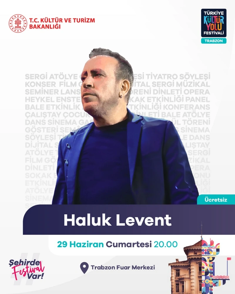 Kültür ve Turizm Bakanlığı tarafından Trabzon’da düzenlenen Türkiye Kültür Yolu Festivali’nin sekizinci günü olan Cumartesi günü (29 Haziran) saat 20.00’de Anadolu rock müziğinin sevilen sanatçısı Haluk Levent sahne alacak.