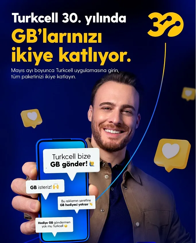 30 yıllık tarihinde Türkiye’nin iletişim ve teknolojisine yön vermenin gururunu yaşayan Turkcell, müşterilerinin hayatına değer katan yepyeni kampanyalara imza atıyor. Mayıs ayı boyunca tüm Turkcell’lilerin ve yeni Turkcell müşterilerinin paketlerindeki GB’lar ikiye katlanacak, 30. yıl kutlamaları farklı sürprizlerle yıl boyu devam edecek.