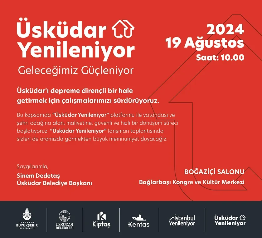 “Üsküdar Yenileniyor, Geleceğimiz Güçleniyor” mottosuyla Bağlarbaşı Kültür Merkezi̇ Boğaziçi Salonu’nda 19 Ağustos Pazartesi günü saat 10.00’da düzenlenecek lansmana Üsküdar Belediye Başkanı Sinem Dedetaş, İBB Genel Sekreter Yardımcısı Gürkan Akgün, İstanbul Büyükşehir Belediyesi (İBB) KİPTAŞ Genel Müdürü Ali Kurt, KENTAŞ Genel Müdürü Nazım Akkoyunlu, vatandaşlar ve basın mensupları katılacak.