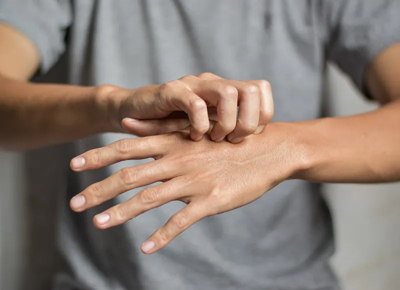Belirtiler genellikle ilk olarak el-bilek içi üzerinde, parmak aralarında ve genital bölgelerde başlamaktadır.