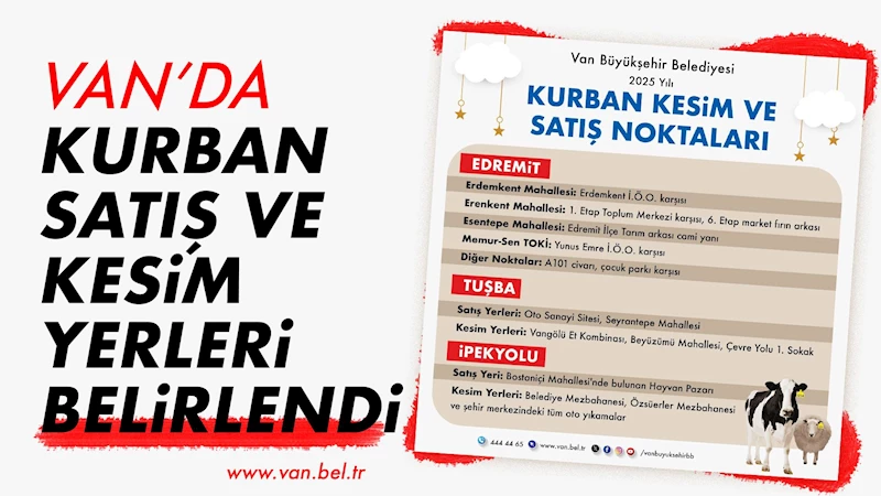 Van Büyükşehir Belediyesi İşletme ve İştirakler Daire Başkanlığı tarafından Kurban Bayramı öncesi Edremit, Tuşba ve İpekyolu ilçelerinde kurban satış ve kesim yerleri belirlendi.