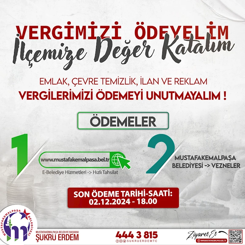 Mustafakemalpaşa Belediyesi, 2024 yılı Emlak, Çevre Temizlik, İlan ve Reklam Vergileri ikinci taksit ödemelerinde son günün 2 Aralık 2024 Pazartesi günü olduğunu duyurdu.