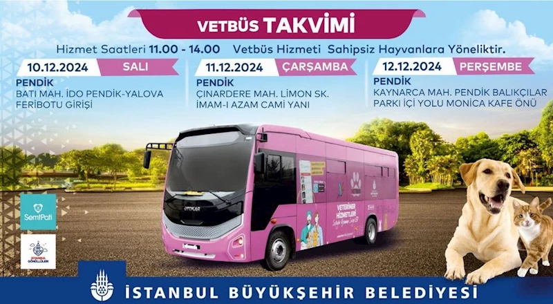 2022 yılından bu yana İBB, VetBüs aracıyla çalışma alanlarında yer alan sahipsiz hayvanların aşılama ve tedavi ihtiyaçlarının giderilmesini sağlıyor. İBB Veteriner Hizmetleri Şube Müdürlüğü tarafından 2024 yılının ilk 11 ayında ise, 298 muayene ve tedavi, 7 bin 366 aşılama ve 2 bin 90 mikroçip uygulaması yapıldı. Aralık ayı VetBüs programında, geçtiğimiz hafta Çekmeköy ve Ataşehir ilçelerinde hizmet sunulurken bu hafta, Pendik ilçesinde ve önümüzdeki hafta ise Tuzla, Maltepe ve Kartal ilçelerinde hizmet verilecek.