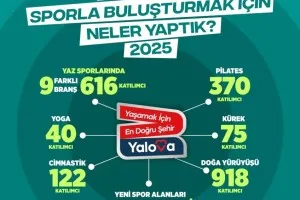 Yalova Belediyesi, altyapı yatırımlarının yanı sıra sporu toplumun her kesimine yaymak amacıyla yıl boyunca birçok etkinlik ve organizasyon düzenledi. Yaz sporları kapsamında 9 farklı branşta 616 kişi sporla buluşturuldu. Pilates etkinliklerine 370, yoga çalışmalarına 40, jimnastik branşına 122, kürek sporuna 75 kişi katıldı. Doğa yürüyüşleri ise 918 katılımcıyla yoğun ilgi gördü. Spor yatırımları çerçevesinde yeni spor alanları oluşturulurken, Yalova Belediye Spor Kulübü Merkezi de vatandaşların hizmetine sunuldu.