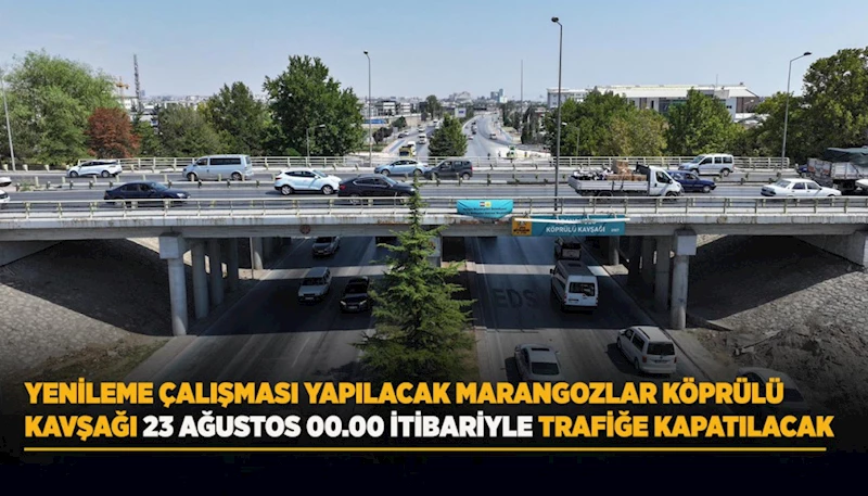 Yapılacak çalışmalar nedeniyle Marangozlar Kavşağı, 23 Ağustos Cumartesi gece 00.00’dan itibaren araç trafiğine kapatılacak. Çalışmalar kapsamında hem Marangozlar Kavşağı hem de Ankara Caddesi’nde çalışmanın yapılacağı alan kullanılamayacak. Vatandaşların mağduriyet yaşamamaları adına alternatif güzergahları ve servis yollarını kullanmaları önemle duyurulur.