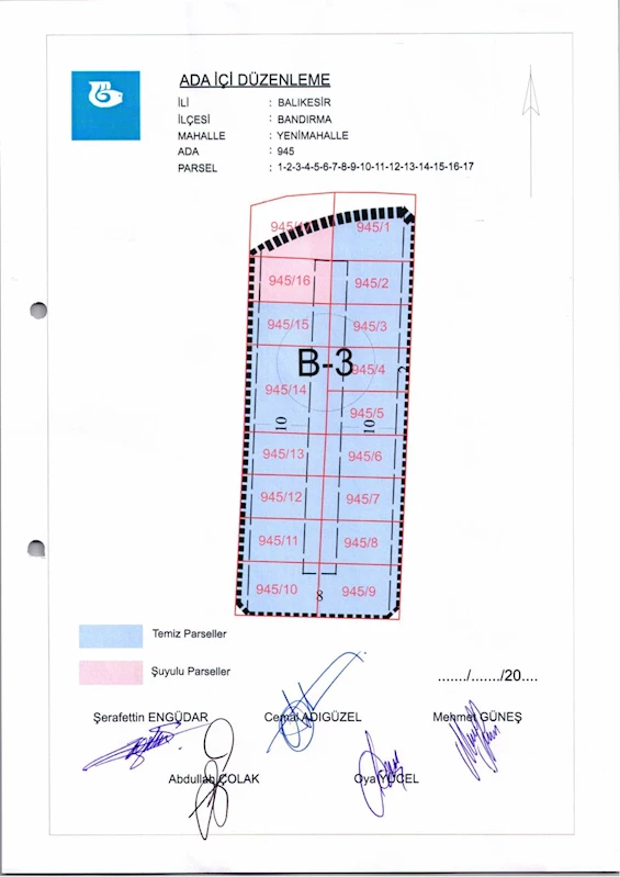 Belediye Encümeninin 24.04.2025 tarih ve 324 sayılı Encümen kararı ile Yenimahalle , 945 ada 1-2-3-4-5-6-7-8-9-10-11-12-13-14-15-16-17 nolu parsellere ait ada içi düzenlemesinin, 1/1000 ölçekli Bandırma Uygulama İmar Planı notlarının 137. Maddesi ve 3194 sayılı İmar Kanununun 19. maddesi gereği onaylanmasına,