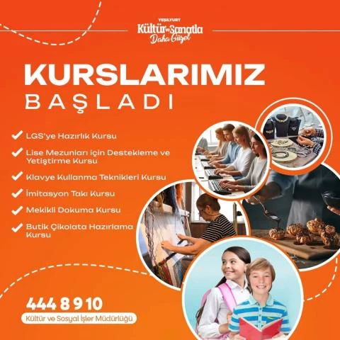 Her yaştan vatandaşın sosyal, sanatsal ve sportif gelişimlerine katkıda bulunacak çalışmalara büyük önem verdiklerini söyleyen Yeşilyurt Belediyesi Kültür ve Sosyal İşler Müdürlüğünden sorumlu Başkan Yardımcısı Cavit Aslan, “Kurslarımızla hemşehrilerimizin hem yeteneklerini geliştirmelerini hem de sosyal bir ortamda vakit geçirmelerini sağlıyoruz. İlçe Halk Eğitim Merkezimizle ortaklaşa açtığımız yeni kurslarımızda eğitim görecek olan kursiyerlerimiz, uzmanlık kazanarak meslek sahibi olarak hem iş bulması ve hem de kendi iş yerini açabilme imkanına kavuşacak. Kurs sonunda kursiyerlerimize sertifikalarını takdim edeceğiz.” dedi.