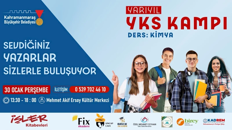 Büyükşehir Belediyesi ve paydaş eğitim kurumları iş birliğiyle Mehmet Akif Ersoy Kültür Merkezi’nde düzenlenen ücretsiz YKS kampı, 30 Ocak Perşembe günü kimya dersiyle devam edecek. 13.30 – 18.00 saatleri arasında gerçekleştirilecek programa tüm üniversite adayları davet edildi.