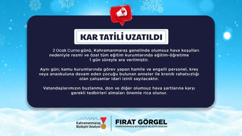 Şehir genelinde etkili olan olumsuz hava koşulları nedeniyle 2 Ocak Cuma günü resmi ve özel tüm eğitim kurumlarında eğitime 1 gün süreyle ara verildi. Ayrıca; hamile personeller, engelli çalışanlar, çocuğu kreş veya anaokuluna devam eden anneler ile kronik rahatsızlığı bulunan kamu çalışanları da idari izinli sayılacak.