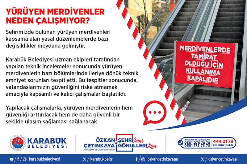 Karabük Belediyesi uzman ekipleri tarafından yapılan teknik incelemeler sonucunda yürüyen merdivenlerin bazı bölümlerinde ileriye dönük teknik emniyet sorunları tespit etti. Bu tespitler sonucunda, vatandaşlarımızın güvenliğini riske atmamak amacıyla kapsamlı ve kalıcı çalışmalar başlatıldı.