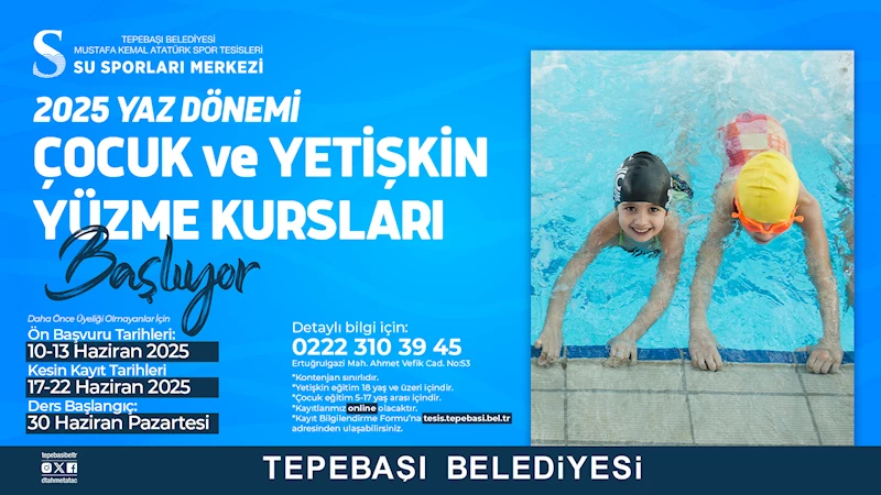 Tepebaşı Belediyesi Mustafa Kemal Atatürk Spor Tesisleri Su Sporları Merkezi’nde düzenlenecek olan 2025 yaz dönemi çocuk ve yetişkin yüzme kursları için başvurular başlıyor.