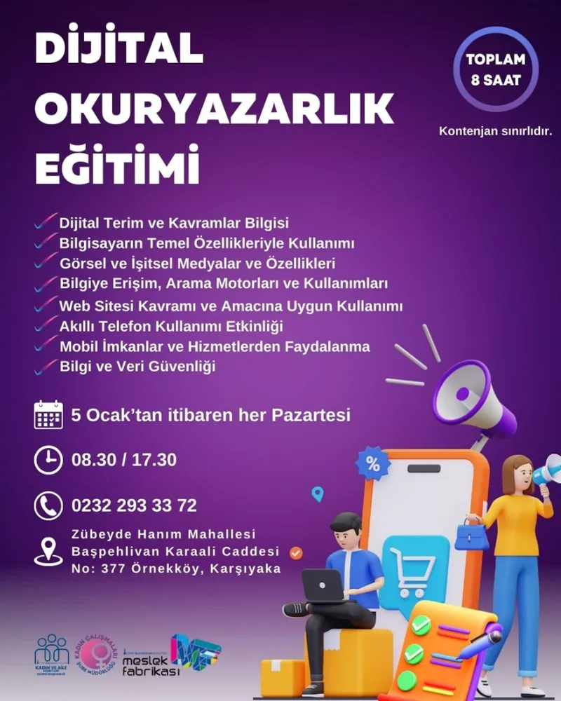İzmir Büyükşehir Belediyesi, kadınları her alanda desteklemeye ve güçlendirmeye devam ediyor. Kadın ve Aile Hizmetleri Dairesi Başkanlığı koordinasyonunda, Meslek Fabrikası iş birliğiyle düzenlenecek dijital okuryazarlık eğitimi, 5 Ocak 2026’dan itibaren her pazartesi 08.30-17.30 saatleri arasında Zübeyde Hanım Mahallesi, Başpehlivan Karaali Caddesi No: 377 Örnekköy / Karşıyaka adresinde yapılacak. Eğitim programında; dijital terim ve kavramlar, bilgisayar ve akıllı telefon kullanımı, arama motorları, e-devlet ve mobil hizmetler ile bilgi ve veri güvenliği başlıkları ele alınacak. Bilgi ve kayıt için 0232 293 33 72 numaralı telefon aranabiliyor.